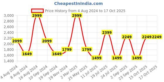 The current price is ₹2,249, which is ₹750 (50.0%) higher than the best price of ₹1,499 last seen on 11 Jul 2025. Over the 438 day price history period, prices have ranged from ₹1,499 to ₹2,999, with an average of ₹2,049. The pricing shows high volatility with significant fluctuations, but the overall trend is concerning as prices are getting more expensive. In terms of recent activity, there have been 0 price changes this week, 1 this month, and 8 over the past year. Consider waiting before making a purchase as prices are rising and better deals may be available later.