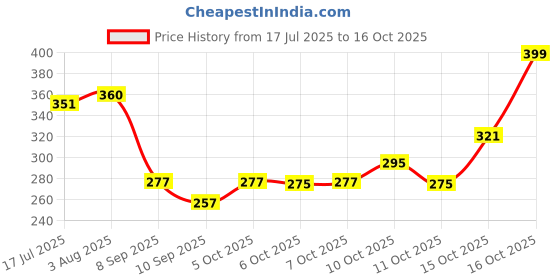 The current price is ₹399, which is ₹142 (55.3%) higher than the best price of ₹257 last seen on 10 Sep 2025. Over the 91 day price history period, prices have ranged from ₹257 to ₹399, with an average of ₹306. The pricing shows moderate volatility, but the overall trend is concerning as prices are getting more expensive. In terms of recent activity, there have been 3 price changes this week, 6 this month, and 10 over the past year. Consider waiting before making a purchase as prices are rising and better deals may be available later.
