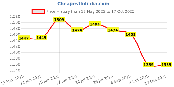 Great news for shoppers! The current price of ₹1,359 is at its best ever level. Over the 157 day price history period, prices have ranged from ₹1,359 to ₹1,509, with an average of ₹1,447. The pricing has been quite stable with low volatility, and the overall trend is favorable for consumers as prices are getting cheaper. In terms of recent activity, there have been 0 price changes this week, 0 this month, and 7 over the past year. If you need this product now, it's a reasonable time to buy as prices are stable, but you might want to monitor for potential better deals.