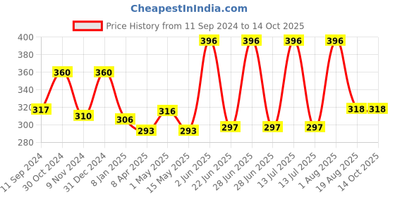 The current price is ₹318, which is ₹25 (8.5%) higher than the best price of ₹293 last seen on 8 Apr 2025. Over the 397 day price history period, prices have ranged from ₹293 to ₹396, with an average of ₹333. The pricing shows moderate volatility, with prices remaining relatively stable overall. In terms of recent activity, there have been 0 price changes this week, 0 this month, and 14 over the past year. If you need this product now, it's a reasonable time to buy as prices are stable, but you might want to monitor for potential better deals.