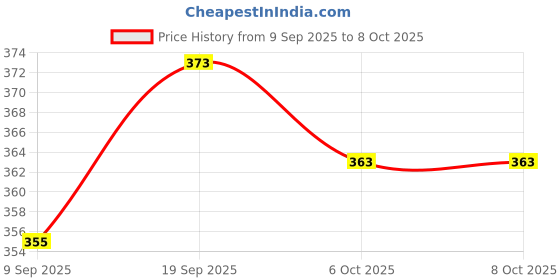 The current price is ₹363, which is ₹8 (2.3%) higher than the best price of ₹355 last seen on 9 Sep 2025. Over the 28 day price history period, prices have ranged from ₹355 to ₹373, with an average of ₹364. The pricing has been quite stable with low volatility, with prices remaining relatively stable overall. In terms of recent activity, there have been 0 price changes this week, 2 this month, and 2 over the past year. If you need this product now, it's a reasonable time to buy as prices are stable, but you might want to monitor for potential better deals.