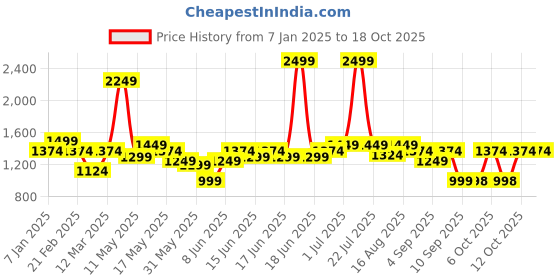 The current price is ₹1,374, which is ₹376 (37.7%) higher than the best price of ₹998 last seen on 19 Sep 2025. Over the 284 day price history period, prices have ranged from ₹998 to ₹2,499, with an average of ₹1,400. The pricing shows high volatility with significant fluctuations, with prices remaining relatively stable overall. In terms of recent activity, there have been 0 price changes this week, 3 this month, and 32 over the past year. The price direction is uncertain, so monitor the situation for a few more days before making a decision.
