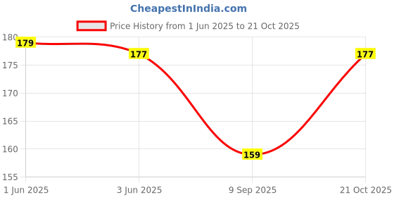The current price is ₹177, which is ₹18 (11.3%) higher than the best price of ₹159 last seen on 9 Sep 2025. Over the 142 day price history period, prices have ranged from ₹159 to ₹179, with an average of ₹173. The pricing has been quite stable with low volatility, with prices remaining relatively stable overall. In terms of recent activity, there have been 0 price changes this week, 0 this month, and 3 over the past year. If you need this product now, it's a reasonable time to buy as prices are stable, but you might want to monitor for potential better deals.