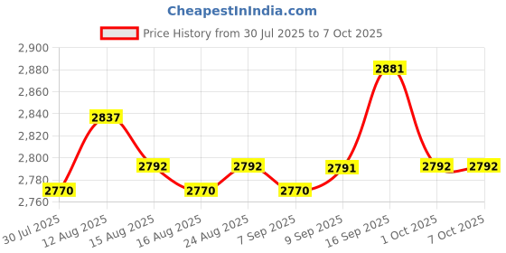 The current price is ₹2,792, which is ₹22 (0.8%) higher than the best price of ₹2,770 last seen on 30 Jul 2025. Over the 68 day price history period, prices have ranged from ₹2,770 to ₹2,881, with an average of ₹2,799. The pricing has been quite stable with low volatility, with prices remaining relatively stable overall. In terms of recent activity, there have been 0 price changes this week, 3 this month, and 8 over the past year. If you need this product now, it's a reasonable time to buy as prices are stable, but you might want to monitor for potential better deals.