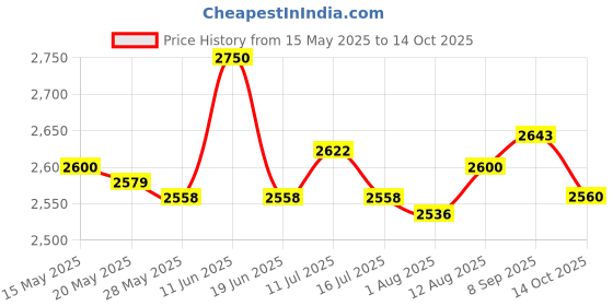 The current price is ₹2,560, which is ₹24 (0.9%) higher than the best price of ₹2,536 last seen on 1 Aug 2025. Over the 152 day price history period, prices have ranged from ₹2,536 to ₹2,750, with an average of ₹2,597. The pricing has been quite stable with low volatility, with prices remaining relatively stable overall. In terms of recent activity, there have been 0 price changes this week, 0 this month, and 10 over the past year. If you need this product now, it's a reasonable time to buy as prices are stable, but you might want to monitor for potential better deals.