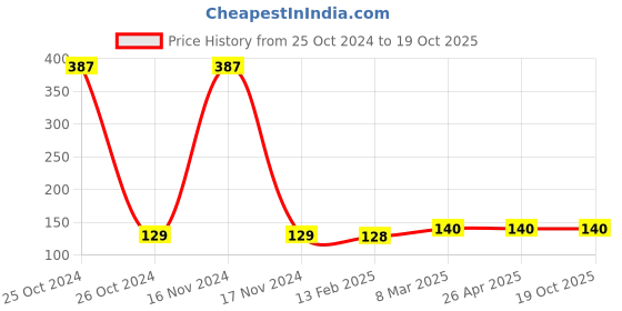 The current price is ₹140, which is ₹11.38 (8.8%) higher than the best price of ₹128.62 last seen on 13 Feb 2025. Over the 358 day price history period, prices have ranged from ₹128.62 to ₹387, with an average of ₹198. The pricing shows high volatility with significant fluctuations, and the overall trend is favorable for consumers as prices are getting cheaper. In terms of recent activity, there have been 0 price changes this week, 0 this month, and 6 over the past year. If you need this product now, it's a reasonable time to buy as prices are stable, but you might want to monitor for potential better deals.