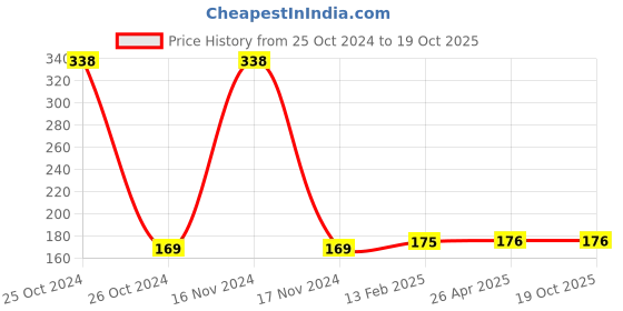 The current price is ₹176, which is ₹7 (4.1%) higher than the best price of ₹169 last seen on 26 Oct 2024. Over the 358 day price history period, prices have ranged from ₹169 to ₹338, with an average of ₹220. The pricing shows high volatility with significant fluctuations, and the overall trend is favorable for consumers as prices are getting cheaper. In terms of recent activity, there have been 0 price changes this week, 0 this month, and 5 over the past year. If you need this product now, it's a reasonable time to buy as prices are stable, but you might want to monitor for potential better deals.