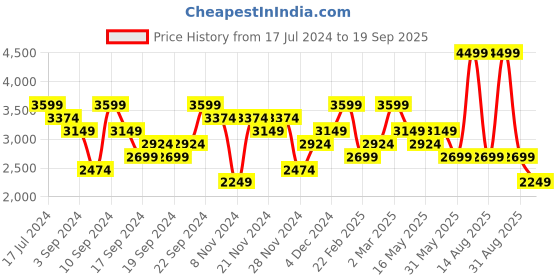 Fantastic! The current price of ₹2,249 is at its best ever level. Over the 429 day price history period, prices have ranged from ₹2,249 to ₹4,499, with an average of ₹3,114. The pricing shows high volatility with significant fluctuations, and the overall trend is favorable for consumers as prices are getting cheaper. In terms of recent activity, there have been 0 price changes this week, 0 this month, and 20 over the past year. This is an excellent time to make a purchase as prices are trending downward and conditions appear favorable.