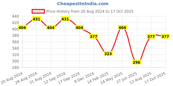 The current price is ₹377, which is ₹81 (27.4%) higher than the best price of ₹296 last seen on 27 Jun 2025. Over the 422 day price history period, prices have ranged from ₹296 to ₹431, with an average of ₹384. The pricing shows moderate volatility, and the overall trend is favorable for consumers as prices are getting cheaper. In terms of recent activity, there have been 0 price changes this week, 0 this month, and 4 over the past year. If you need this product now, it's a reasonable time to buy as prices are stable, but you might want to monitor for potential better deals.