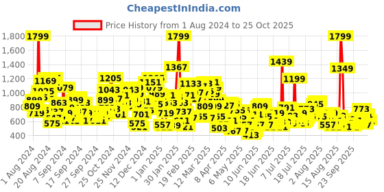 The current price is ₹701, which is ₹288 (69.7%) higher than the best price of ₹413 last seen on 2 Jun 2025. Over the 433 day price history period, prices have ranged from ₹413 to ₹1,799, with an average of ₹775. The pricing shows high volatility with significant fluctuations, and the overall trend is favorable for consumers as prices are getting cheaper. In terms of recent activity, there have been 0 price changes this week, 5 this month, and 142 over the past year. If you need this product now, it's a reasonable time to buy as prices are stable, but you might want to monitor for potential better deals.