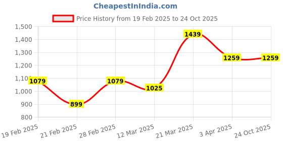 The current price is ₹1,259, which is ₹360 (40.0%) higher than the best price of ₹899 last seen on 21 Feb 2025. Over the 247 day price history period, prices have ranged from ₹899 to ₹1,439, with an average of ₹1,148. The pricing shows moderate volatility, but the overall trend is concerning as prices are getting more expensive. In terms of recent activity, there have been 0 price changes this week, 0 this month, and 5 over the past year. The price direction is uncertain, so monitor the situation for a few more days before making a decision.