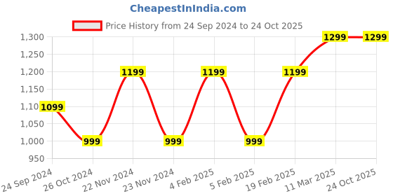 The current price is ₹1,299, which is ₹300 (30.0%) higher than the best price of ₹999 last seen on 26 Oct 2024. Over the 395 day price history period, prices have ranged from ₹999 to ₹1,299, with an average of ₹1,143. The pricing shows moderate volatility, but the overall trend is concerning as prices are getting more expensive. In terms of recent activity, there have been 0 price changes this week, 0 this month, and 6 over the past year. If you need this product now, it's a reasonable time to buy as prices are stable, but you might want to monitor for potential better deals.