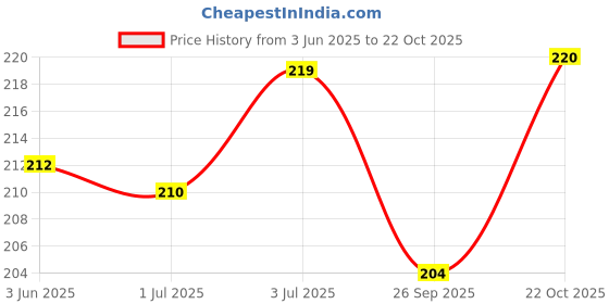The current price is ₹220, which is ₹16 (7.8%) higher than the best price of ₹204 last seen on 26 Sep 2025. Over the 141 day price history period, prices have ranged from ₹204 to ₹220, with an average of ₹213. The pricing has been quite stable with low volatility, with prices remaining relatively stable overall. In terms of recent activity, there have been 0 price changes this week, 1 this month, and 4 over the past year. If you need this product now, it's a reasonable time to buy as prices are stable, but you might want to monitor for potential better deals.