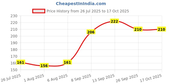The current price is ₹210, which is ₹54 (34.6%) higher than the best price of ₹156 last seen on 1 Aug 2025. Over the 82 day price history period, prices have ranged from ₹156 to ₹222, with an average of ₹189. The pricing shows moderate volatility, but the overall trend is concerning as prices are getting more expensive. In terms of recent activity, there have been 0 price changes this week, 0 this month, and 5 over the past year. If you need this product now, it's a reasonable time to buy as prices are stable, but you might want to monitor for potential better deals.