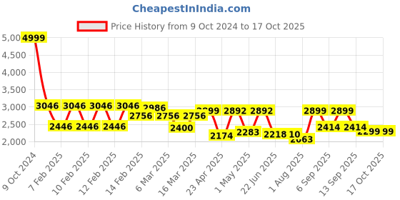 The current price is ₹2,299, which is ₹236 (11.4%) higher than the best price of ₹2,063 last seen on 1 Aug 2025. Over the 372 day price history period, prices have ranged from ₹2,063 to ₹4,999, with an average of ₹2,705. The pricing shows high volatility with significant fluctuations, and the overall trend is favorable for consumers as prices are getting cheaper. In terms of recent activity, there have been 0 price changes this week, 0 this month, and 24 over the past year. This is an excellent time to make a purchase as prices are trending downward and conditions appear favorable.