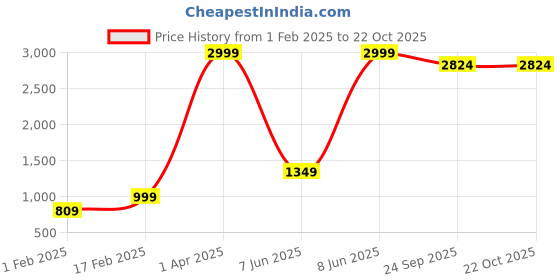 The current price is ₹2,824, which is ₹2,015 (249.1%) higher than the best price of ₹809 last seen on 1 Feb 2025. Over the 262 day price history period, prices have ranged from ₹809 to ₹2,999, with an average of ₹2,115. The pricing shows high volatility with significant fluctuations, but the overall trend is concerning as prices are getting more expensive. In terms of recent activity, there have been 0 price changes this week, 0 this month, and 5 over the past year. The price direction is uncertain, so monitor the situation for a few more days before making a decision.