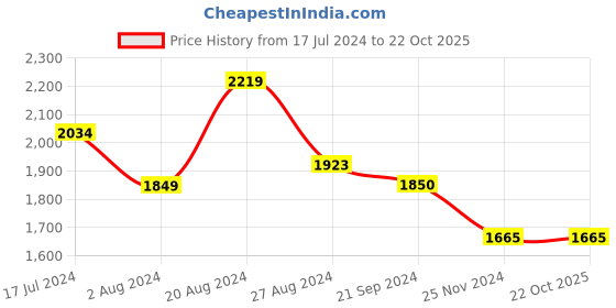 Awesome! The current price of ₹1,665 is at its best ever level. Over the 461 day price history period, prices have ranged from ₹1,665 to ₹2,219, with an average of ₹1,886. The pricing shows moderate volatility, and the overall trend is favorable for consumers as prices are getting cheaper. In terms of recent activity, there have been 0 price changes this week, 0 this month, and 0 over the past year. This is an excellent time to make a purchase as prices are trending downward and conditions appear favorable.