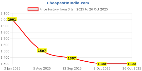 Awesome! The current price of ₹1,300 is at its best ever level. Over the 294 day price history period, prices have ranged from ₹1,300 to ₹2,001, with an average of ₹1,499. The pricing shows high volatility with significant fluctuations, and the overall trend is favorable for consumers as prices are getting cheaper. In terms of recent activity, there have been 0 price changes this week, 0 this month, and 3 over the past year. If you need this product now, it's a reasonable time to buy as prices are stable, but you might want to monitor for potential better deals.