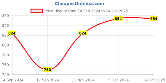 The current price is ₹854, which is ₹104 (13.9%) higher than the best price of ₹750 last seen on 17 Sep 2024. Over the 405 day price history period, prices have ranged from ₹750 to ₹854, with an average of ₹821. The pricing has been quite stable with low volatility, with prices remaining relatively stable overall. In terms of recent activity, there have been 0 price changes this week, 0 this month, and 1 over the past year. If you need this product now, it's a reasonable time to buy as prices are stable, but you might want to monitor for potential better deals.