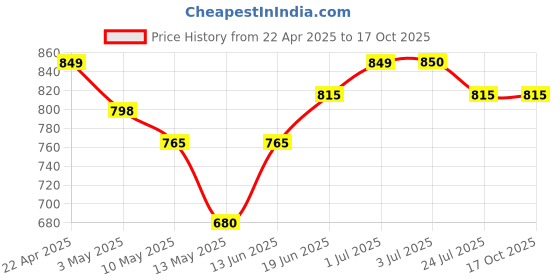 The current price is ₹815, which is ₹135 (19.9%) higher than the best price of ₹680 last seen on 13 May 2025. Over the 177 day price history period, prices have ranged from ₹680 to ₹850, with an average of ₹800. The pricing shows moderate volatility, with prices remaining relatively stable overall. In terms of recent activity, there have been 0 price changes this week, 0 this month, and 8 over the past year. If you need this product now, it's a reasonable time to buy as prices are stable, but you might want to monitor for potential better deals.