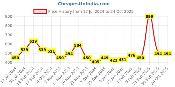 The current price is ₹494, which is ₹89 (22.0%) higher than the best price of ₹405 last seen on 7 Dec 2024. Over the 464 day price history period, prices have ranged from ₹405 to ₹899, with an average of ₹510. The pricing shows high volatility with significant fluctuations, but the overall trend is concerning as prices are getting more expensive. In terms of recent activity, there have been 0 price changes this week, 1 this month, and 11 over the past year. The price direction is uncertain, so monitor the situation for a few more days before making a decision.