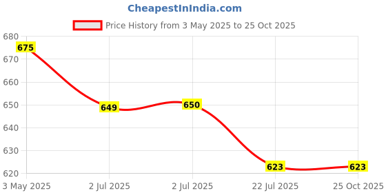 Good news! The current price of ₹623 is at its best ever level. Over the 174 day price history period, prices have ranged from ₹623 to ₹675, with an average of ₹644. The pricing has been quite stable with low volatility, and the overall trend is favorable for consumers as prices are getting cheaper. In terms of recent activity, there have been 0 price changes this week, 0 this month, and 3 over the past year. If you need this product now, it's a reasonable time to buy as prices are stable, but you might want to monitor for potential better deals.