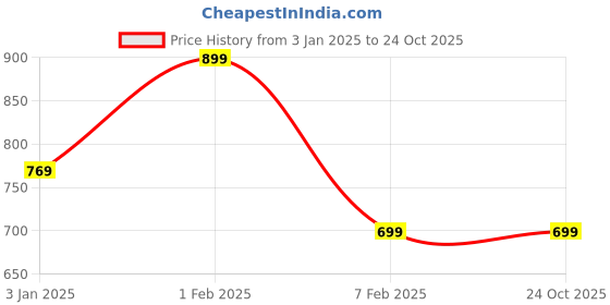 Exciting update! The current price of ₹699 is at its best ever level. Over the 294 day price history period, prices have ranged from ₹699 to ₹899, with an average of ₹767. The pricing shows moderate volatility, and the overall trend is favorable for consumers as prices are getting cheaper. In terms of recent activity, there have been 0 price changes this week, 0 this month, and 2 over the past year. This is an excellent time to make a purchase as prices are trending downward and conditions appear favorable.