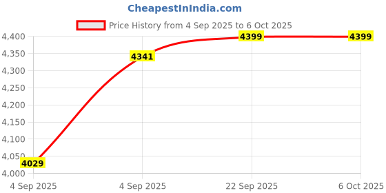The current price is ₹4,399, which is ₹370 (9.2%) higher than the best price of ₹4,029 last seen on 4 Sep 2025. Over the 31 day price history period, prices have ranged from ₹4,029 to ₹4,399, with an average of ₹4,292. The pricing has been quite stable with low volatility, but the overall trend is concerning as prices are getting more expensive. In terms of recent activity, there have been 0 price changes this week, 0 this month, and 2 over the past year. If you need this product now, it's a reasonable time to buy as prices are stable, but you might want to monitor for potential better deals.
