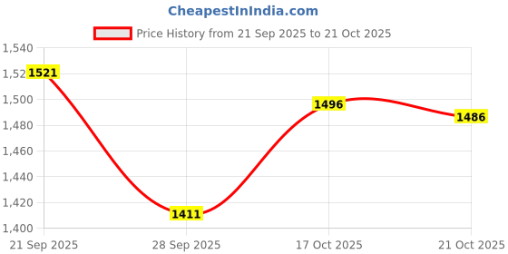 The current price is ₹1,486, which is ₹75 (5.3%) higher than the best price of ₹1,411 last seen on 28 Sep 2025. Over the 30 day price history period, prices have ranged from ₹1,411 to ₹1,521, with an average of ₹1,479. The pricing has been quite stable with low volatility, with prices remaining relatively stable overall. In terms of recent activity, there have been 0 price changes this week, 2 this month, and 3 over the past year. If you need this product now, it's a reasonable time to buy as prices are stable, but you might want to monitor for potential better deals.