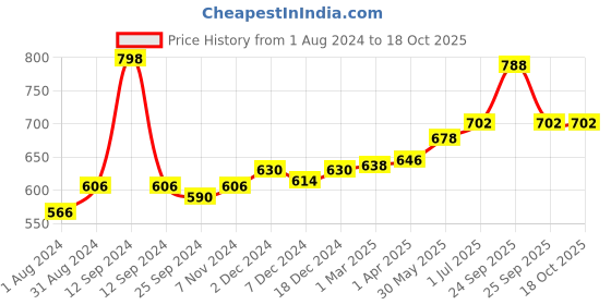 The current price is ₹702, which is ₹136 (24.0%) higher than the best price of ₹566 last seen on 1 Aug 2024. Over the 443 day price history period, prices have ranged from ₹566 to ₹798, with an average of ₹656. The pricing shows moderate volatility, but the overall trend is concerning as prices are getting more expensive. In terms of recent activity, there have been 0 price changes this week, 1 this month, and 9 over the past year. If you need this product now, it's a reasonable time to buy as prices are stable, but you might want to monitor for potential better deals.