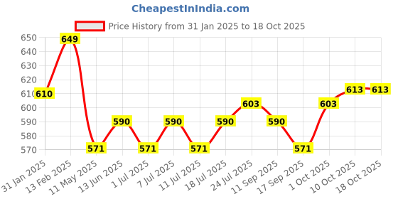 The current price is ₹613, which is ₹42 (7.4%) higher than the best price of ₹571 last seen on 11 May 2025. Over the 260 day price history period, prices have ranged from ₹571 to ₹649, with an average of ₹595. The pricing has been quite stable with low volatility, with prices remaining relatively stable overall. In terms of recent activity, there have been 0 price changes this week, 1 this month, and 12 over the past year. If you need this product now, it's a reasonable time to buy as prices are stable, but you might want to monitor for potential better deals.