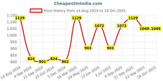 The current price is ₹1,049.97, which is ₹248.97 (31.1%) higher than the best price of ₹801 last seen on 21 Sep 2024. Over the 430 day price history period, prices have ranged from ₹801 to ₹1,129, with an average of ₹976. The pricing shows moderate volatility, and the overall trend is favorable for consumers as prices are getting cheaper. In terms of recent activity, there have been 0 price changes this week, 1 this month, and 8 over the past year. If you need this product now, it's a reasonable time to buy as prices are stable, but you might want to monitor for potential better deals.