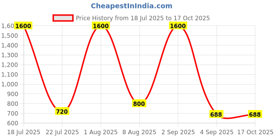 Exciting update! The current price of ₹688 is at its best ever level. Over the 90 day price history period, prices have ranged from ₹688 to ₹1,600, with an average of ₹1,099. The pricing shows high volatility with significant fluctuations, and the overall trend is favorable for consumers as prices are getting cheaper. In terms of recent activity, there have been 0 price changes this week, 0 this month, and 5 over the past year. This is an excellent time to make a purchase as prices are trending downward and conditions appear favorable.