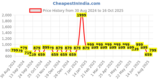 The current price is ₹799, which is ₹140 (21.2%) higher than the best price of ₹659 last seen on 24 Sep 2024. Over the 412 day price history period, prices have ranged from ₹659 to ₹1,999, with an average of ₹885. The pricing shows high volatility with significant fluctuations, with prices remaining relatively stable overall. In terms of recent activity, there have been 0 price changes this week, 0 this month, and 25 over the past year. If you need this product now, it's a reasonable time to buy as prices are stable, but you might want to monitor for potential better deals.