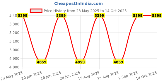 The current price is ₹5,399, which is ₹540 (11.1%) higher than the best price of ₹4,859 last seen on 10 Jun 2025. Over the 143 day price history period, prices have ranged from ₹4,859 to ₹5,399, with an average of ₹5,197. The pricing shows moderate volatility, with prices remaining relatively stable overall. In terms of recent activity, there have been 0 price changes this week, 0 this month, and 6 over the past year. The price direction is uncertain, so monitor the situation for a few more days before making a decision.