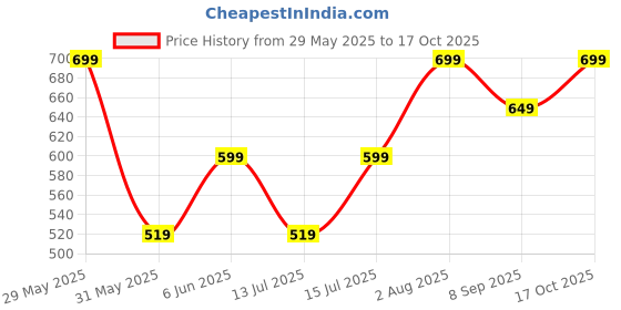 The current price is ₹699, which is ₹180 (34.7%) higher than the best price of ₹519 last seen on 31 May 2025. Over the 141 day price history period, prices have ranged from ₹519 to ₹699, with an average of ₹623. The pricing shows moderate volatility, with prices remaining relatively stable overall. In terms of recent activity, there have been 0 price changes this week, 0 this month, and 7 over the past year. If you need this product now, it's a reasonable time to buy as prices are stable, but you might want to monitor for potential better deals.