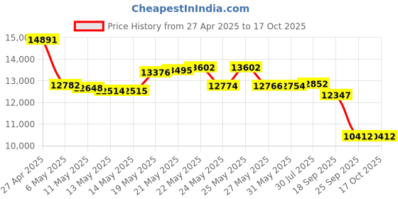 Exciting update! The current price of ₹10,412 is at its best ever level. Over the 172 day price history period, prices have ranged from ₹10,412 to ₹14,891, with an average of ₹12,734. The pricing shows moderate volatility, and the overall trend is favorable for consumers as prices are getting cheaper. In terms of recent activity, there have been 0 price changes this week, 1 this month, and 14 over the past year. This is an excellent time to make a purchase as prices are trending downward and conditions appear favorable.
