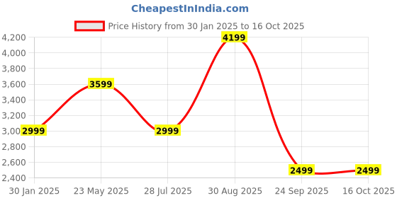 Good news! The current price of ₹2,499 is at its best ever level. Over the 259 day price history period, prices have ranged from ₹2,499 to ₹4,199, with an average of ₹3,132. The pricing shows high volatility with significant fluctuations, and the overall trend is favorable for consumers as prices are getting cheaper. In terms of recent activity, there have been 0 price changes this week, 0 this month, and 4 over the past year. This is an excellent time to make a purchase as prices are trending downward and conditions appear favorable.