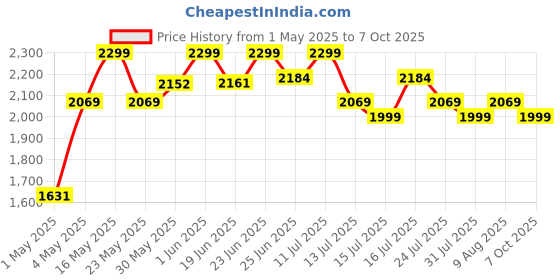 The current price is ₹1,999, which is ₹368 (22.6%) higher than the best price of ₹1,631 last seen on 1 May 2025. Over the 159 day price history period, prices have ranged from ₹1,631 to ₹2,299, with an average of ₹2,109. The pricing shows moderate volatility, but the overall trend is concerning as prices are getting more expensive. In terms of recent activity, there have been 0 price changes this week, 0 this month, and 16 over the past year. If you need this product now, it's a reasonable time to buy as prices are stable, but you might want to monitor for potential better deals.