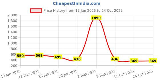 Awesome! The current price of ₹369 is at its best ever level. Over the 284 day price history period, prices have ranged from ₹369 to ₹1,899, with an average of ₹641. The pricing shows high volatility with significant fluctuations, and the overall trend is favorable for consumers as prices are getting cheaper. In terms of recent activity, there have been 0 price changes this week, 0 this month, and 6 over the past year. If you need this product now, it's a reasonable time to buy as prices are stable, but you might want to monitor for potential better deals.