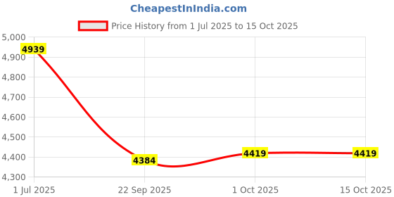 The current price is ₹4,419, which is ₹35 (0.8%) higher than the best price of ₹4,384 last seen on 22 Sep 2025. Over the 105 day price history period, prices have ranged from ₹4,384 to ₹4,939, with an average of ₹4,540. The pricing shows moderate volatility, and the overall trend is favorable for consumers as prices are getting cheaper. In terms of recent activity, there have been 0 price changes this week, 1 this month, and 2 over the past year. If you need this product now, it's a reasonable time to buy as prices are stable, but you might want to monitor for potential better deals.