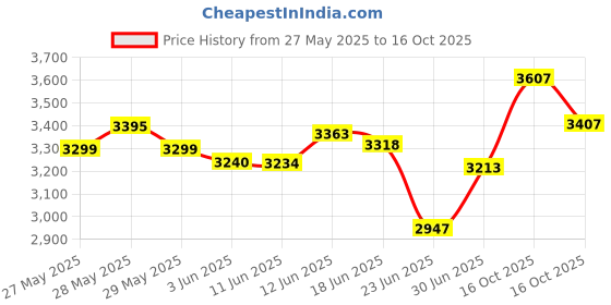 The current price is ₹3,407, which is ₹460 (15.6%) higher than the best price of ₹2,947 last seen on 23 Jun 2025. Over the 142 day price history period, prices have ranged from ₹2,947 to ₹3,607, with an average of ₹3,302. The pricing has been quite stable with low volatility, with prices remaining relatively stable overall. In terms of recent activity, there has been 1 price change this week, 1 this month, and 10 over the past year. The price direction is uncertain, so monitor the situation for a few more days before making a decision.