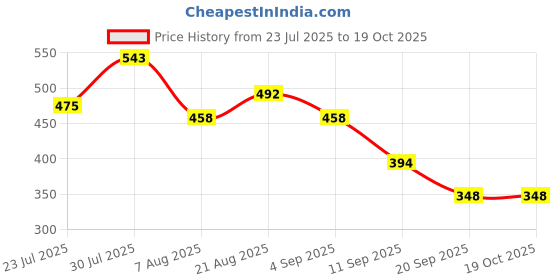 Good news! The current price of ₹348 is at its best ever level. Over the 87 day price history period, prices have ranged from ₹348 to ₹543, with an average of ₹440. The pricing shows moderate volatility, and the overall trend is favorable for consumers as prices are getting cheaper. In terms of recent activity, there have been 0 price changes this week, 0 this month, and 6 over the past year. If you need this product now, it's a reasonable time to buy as prices are stable, but you might want to monitor for potential better deals.