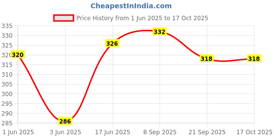 The current price is ₹318, which is ₹32 (11.2%) higher than the best price of ₹286 last seen on 3 Jun 2025. Over the 137 day price history period, prices have ranged from ₹286 to ₹332, with an average of ₹317. The pricing has been quite stable with low volatility, with prices remaining relatively stable overall. In terms of recent activity, there have been 0 price changes this week, 0 this month, and 4 over the past year. If you need this product now, it's a reasonable time to buy as prices are stable, but you might want to monitor for potential better deals.