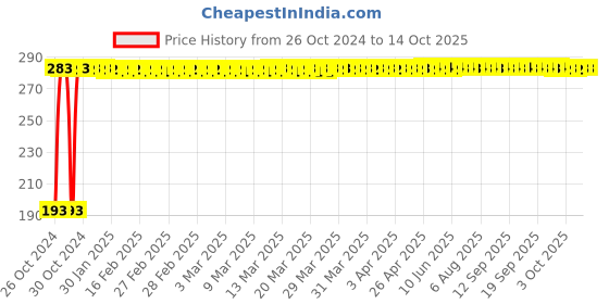 The current price is ₹283, which is ₹90 (46.6%) higher than the best price of ₹193 last seen on 26 Oct 2024. Over the 352 day price history period, prices have ranged from ₹193 to ₹284, with an average of ₹280. The pricing has been quite stable with low volatility, but the overall trend is concerning as prices are getting more expensive. In terms of recent activity, there have been 0 price changes this week, 11 this month, and 92 over the past year. If you need this product now, it's a reasonable time to buy as prices are stable, but you might want to monitor for potential better deals.