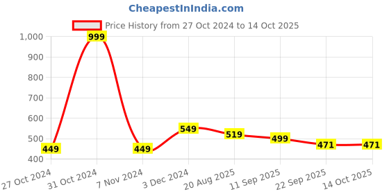 The current price is ₹471, which is ₹22 (4.9%) higher than the best price of ₹449 last seen on 27 Oct 2024. Over the 351 day price history period, prices have ranged from ₹449 to ₹999, with an average of ₹551. The pricing shows high volatility with significant fluctuations, with prices remaining relatively stable overall. In terms of recent activity, there have been 0 price changes this week, 0 this month, and 6 over the past year. If you need this product now, it's a reasonable time to buy as prices are stable, but you might want to monitor for potential better deals.