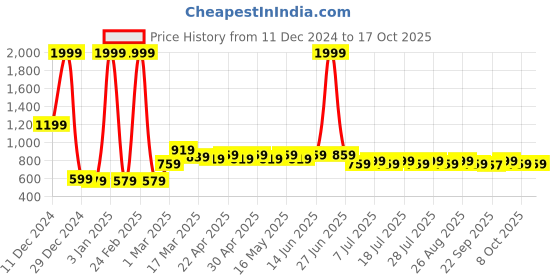 The current price is ₹759, which is ₹180 (31.1%) higher than the best price of ₹579 last seen on 31 Dec 2024. Over the 309 day price history period, prices have ranged from ₹579 to ₹1,999, with an average of ₹932. The pricing shows high volatility with significant fluctuations, and the overall trend is favorable for consumers as prices are getting cheaper. In terms of recent activity, there have been 0 price changes this week, 2 this month, and 32 over the past year. If you need this product now, it's a reasonable time to buy as prices are stable, but you might want to monitor for potential better deals.