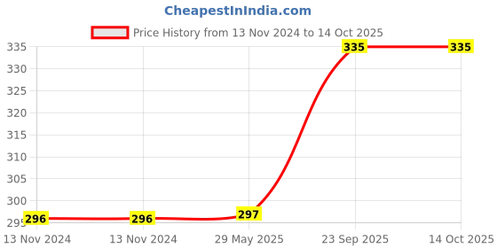 The current price is ₹335, which is ₹39 (13.2%) higher than the best price of ₹296 last seen on 13 Nov 2024. Over the 334 day price history period, prices have ranged from ₹296 to ₹335, with an average of ₹312. The pricing shows moderate volatility, but the overall trend is concerning as prices are getting more expensive. In terms of recent activity, there have been 0 price changes this week, 0 this month, and 3 over the past year. If you need this product now, it's a reasonable time to buy as prices are stable, but you might want to monitor for potential better deals.