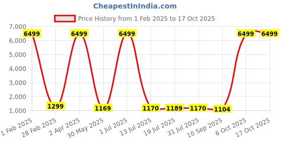 The current price is ₹6,499, which is ₹5,395 (488.7%) higher than the best price of ₹1,104 last seen on 10 Sep 2025. Over the 257 day price history period, prices have ranged from ₹1,104 to ₹6,499, with an average of ₹3,600. The pricing shows high volatility with significant fluctuations, with prices remaining relatively stable overall. In terms of recent activity, there have been 0 price changes this week, 0 this month, and 9 over the past year. The price direction is uncertain, so monitor the situation for a few more days before making a decision.