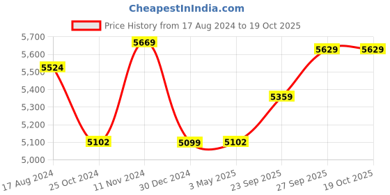 The current price is ₹5,629, which is ₹530 (10.4%) higher than the best price of ₹5,099 last seen on 30 Dec 2024. Over the 427 day price history period, prices have ranged from ₹5,099 to ₹5,669, with an average of ₹5,389. The pricing has been quite stable with low volatility, with prices remaining relatively stable overall. In terms of recent activity, there have been 0 price changes this week, 1 this month, and 5 over the past year. The price direction is uncertain, so monitor the situation for a few more days before making a decision.